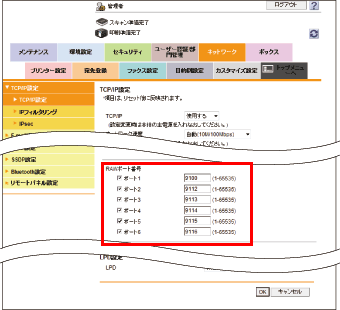 管理者モードの[ネットワーク]-[TCP/IP設定]-[TCP/IP設定]で、必要に応じて、RAWポート番号を変更します(初期値:[ON](チェックあり))。