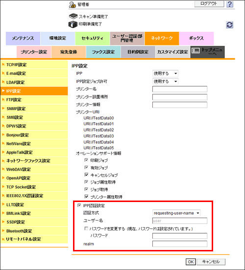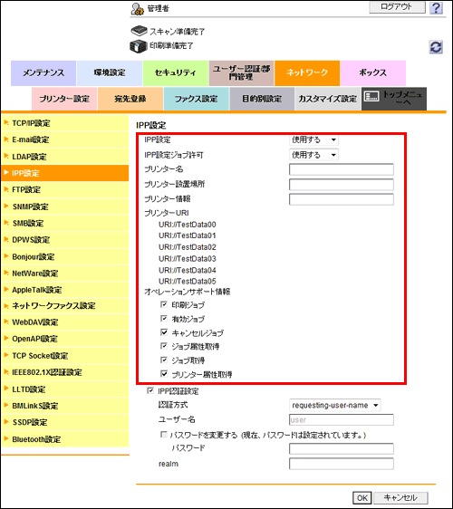 管理者モードの[ネットワーク]-[IPP設定]で、次の設定をします。