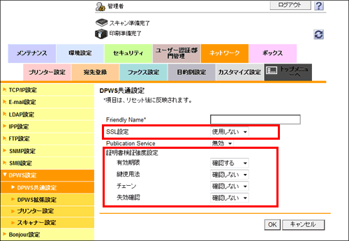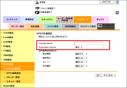 管理者モードの[ネットワーク]-[DPWS設定]-[DPWS共通設定]で、次の設定をします。