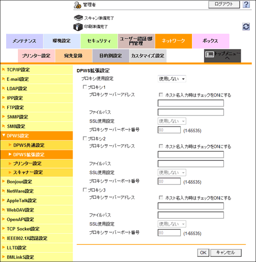 管理者モードの[ネットワーク]-[DPWS設定]-[DPWS拡張設定]で、次の設定をします。