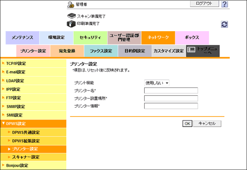 管理者モードの[ネットワーク]-[DPWS設定]-[プリンター設定]で、次の設定をします。