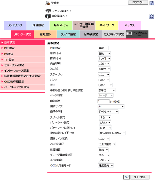 管理者モードの[プリンター設定]-[基本設定]で、次の設定をします。