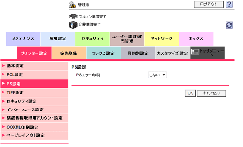 管理者モードの[プリンター設定]-[PS設定]で、次の設定をします。