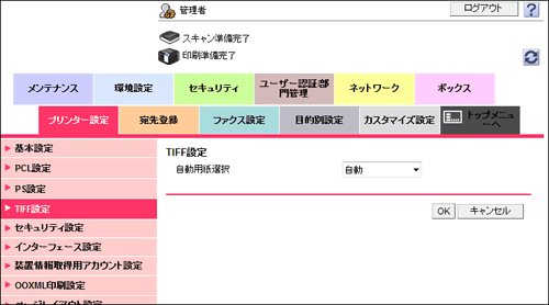 管理者モードの[プリンター設定]-[TIFF設定]で、次の設定をします。