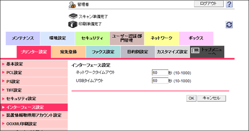 管理者モードの[プリンター設定]-[インターフェース設定]で、次の設定をします。