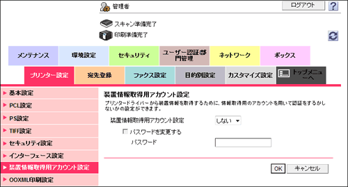 管理者モードの[プリンター設定]-[装置情報取得用アカウント設定]で、次の設定をします。