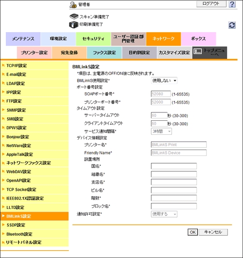 BMLinkSを有効にします。あわせて、BMLinkSのプリンタードライバーと接続するための設定や、本機の情報の登録、BMLinkSへの通知に関する設定などを行えます。