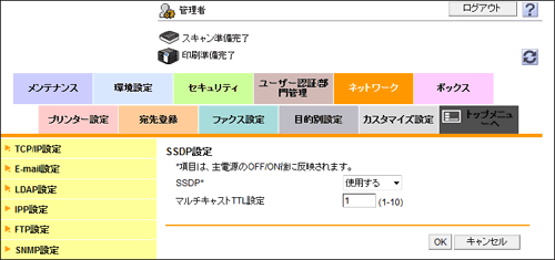 管理者モードの[ネットワーク]-[SSDP設定]で、次の設定をします。