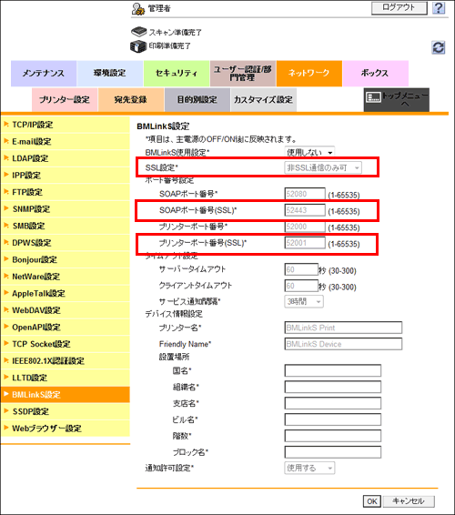 [Friendly Name] | プリンタードライバーに通知する、本機の名前を入力します(全角/半角255バイト以内)。 本機を探すときにわかりやすい名前をつけます。 初期値は[BMLinkS Device]です。 | |