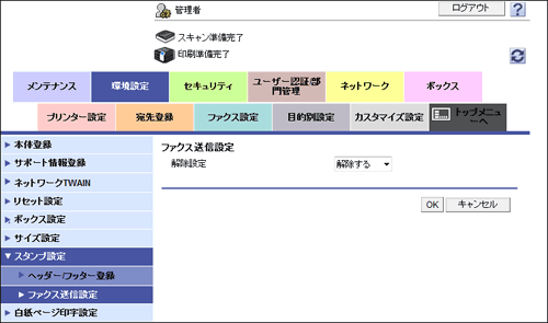 管理者モードの[環境設定]-[スタンプ設定]-[ファクス送信設定]で、[解除設定]を[解除する]に設定します。