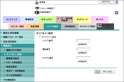 管理者モードの[ファクス設定]-[機能設定]-[ダイアルイン設定]で、次の設定をします。