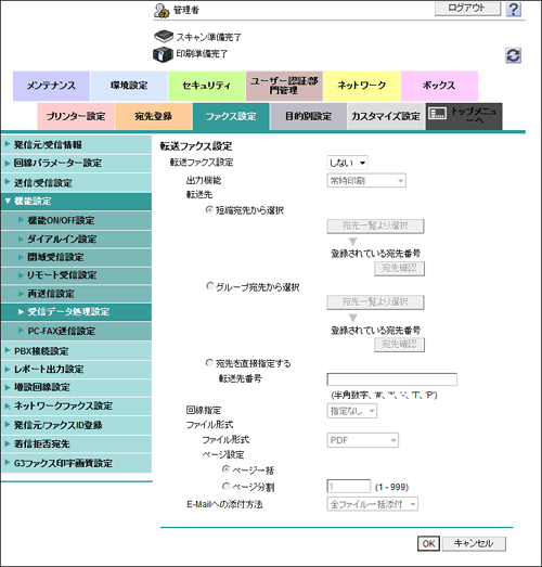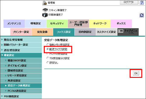 管理者モードの[ファクス設定]-[機能設定]-[受信データ処理設定]で、[転送ファクス設定]を選び、[OK]をクリックします。