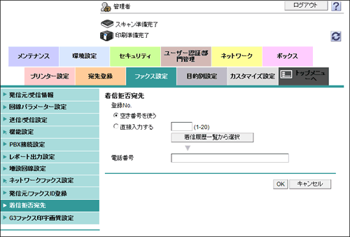 管理者モードの[ファクス設定]-[着信拒否宛先]-[新規登録]で、次の設定をします。