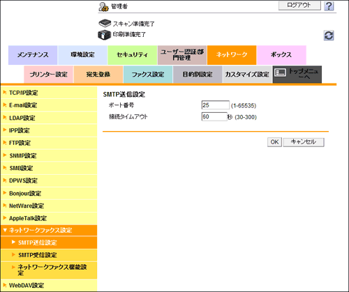 [接続タイムアウト] | 必要に応じて、メールサーバー(SMTP)との通信のタイムアウト時間を変更します。 初期値は[60]秒です。 |