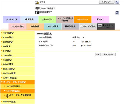 管理者モードの[ネットワーク]-[ネットワークファクス設定]-[SMTP受信設定]で、次の設定をします。