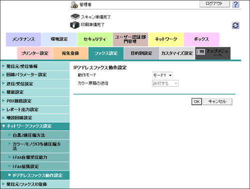 [動作モード] | お使いの環境に合わせて、IPアドレスファクスの動作モードを選びます。