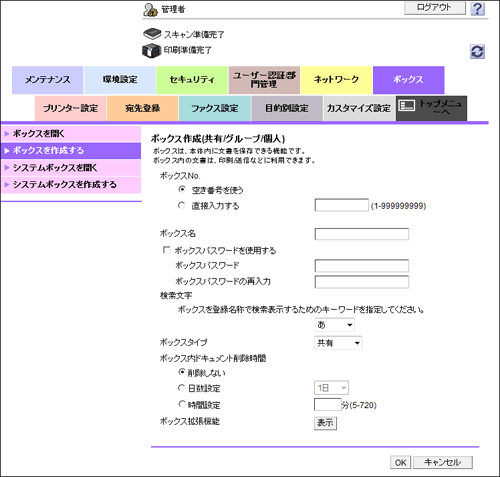 管理者モードの[ボックス]-[ボックスを作成する]で、次の設定をします。