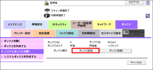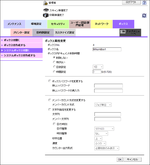 管理者モードにログインすると、ファイリングナンバーボックスのパスワードを入力しなくても、登録されているファイリングナンバーボックスの設定を変更したり、削除したりできます。