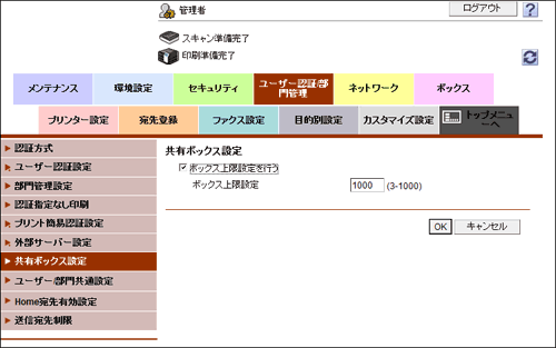 管理者モードの[ユーザー認証/部門管理]-[共有ボックス設定]で、[ボックス上限設定を行う]にチェックをつけます(初期値:[OFF](チェックなし))。