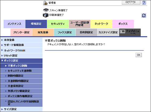 管理者モードの[環境設定]-[ボックス設定]-[不要ボックス削除]で、[OK] をクリックします。