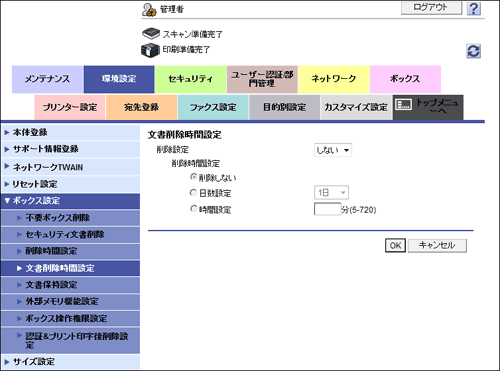 共有/個人/グループボックスにファイルを保存した日時、または最後に印刷、送信した日時から、自動的に削除するまでの時間を、管理者が一括設定します。