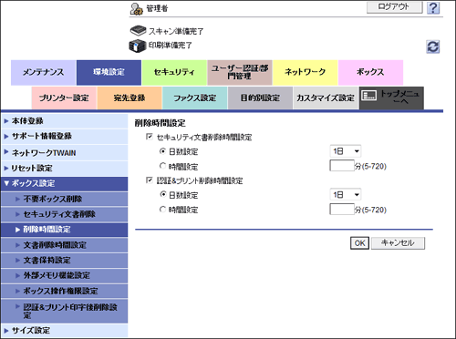 セキュリティー文書ボックスと、認証&プリントボックスにファイルを保存した日時、または最後に印刷した日時から、自動的に削除するまでの時間を設定します。