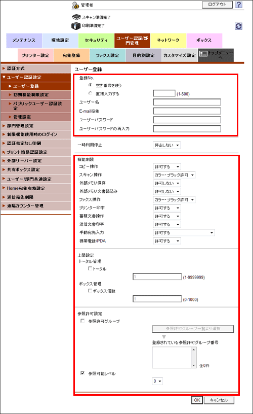 [上限設定] | 必要に応じて、ユーザーが印刷できる枚数の上限や、登録できるボックス数の上限を設定します。 詳しくは、こちらをごらんください。 |