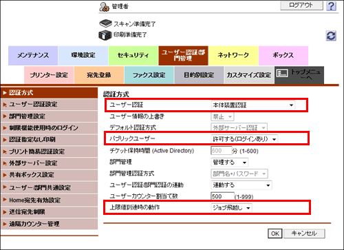 管理者モードの[ユーザー認証/部門管理]-[認証方式]で、次の設定をします。