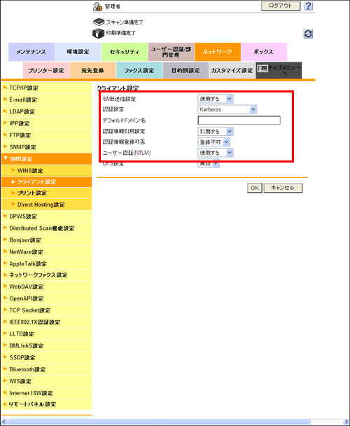 管理者モードの[ネットワーク]-[SMB設定]-[クライアント設定]で、次の設定をします。