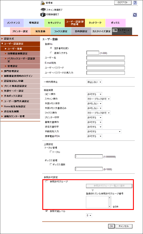管理者モードの[ユーザー認証/部門管理]-[ユーザー認証設定]-[ユーザー登録]-[編集]で、[参照許可グループ]にチェックをつけ、登録ユーザーに対して参照許可グループを割当てます。