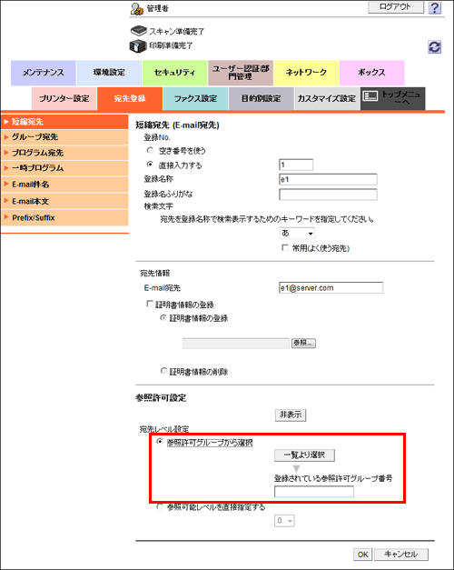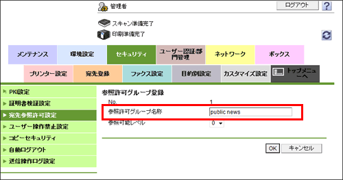 管理者モードの[セキュリティ]-[宛先参照許可設定]-[編集]で、[参照許可グループ名称]にグループの名前を入力し(半角24文字/全角12文字以内)、参照許可グループを登録します。