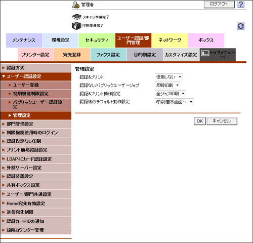 認証&プリント機能の動作を設定します。また、パブリックユーザーからの印刷ジョブや、認証情報のない印刷ジョブを受信したときの動作を設定します。