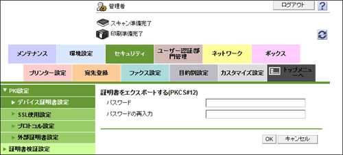 管理者モードの[セキュリティ]-[PKI設定]-[デバイス証明書設定]-[設定]-[証明書をエクスポートする]で、パスワードを入力し(半角32文字以内)、[OK]をクリックします。