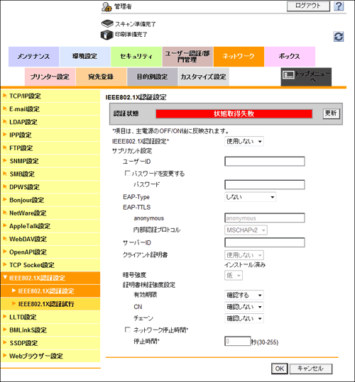 管理者モードの[ネットワーク]-[IEEE802.1X認証設定]-[IEEE802.1X認証試行]で、現在の認証状態を確認できます。また、認証サーバーに対して、認証を実行できます。