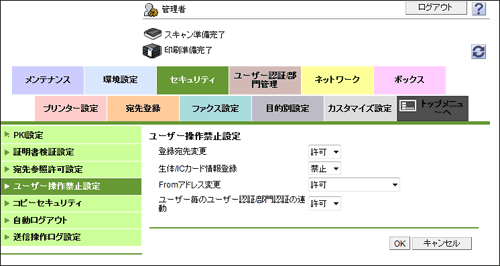 [ユーザー毎のユーザー認証/部門認証の連動] | ユーザーが、自分のユーザー認証と部門認証の連動を設定できないようにする場合は、[禁止]を選びます。 初期値は[許可]です。 |