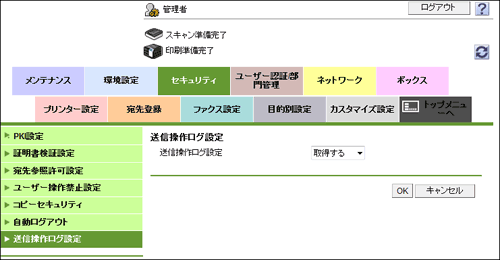 管理者モードの[セキュリティ]-[送信操作ログ設定]で、[取得する]を選びます(初期値:[取得しない])。