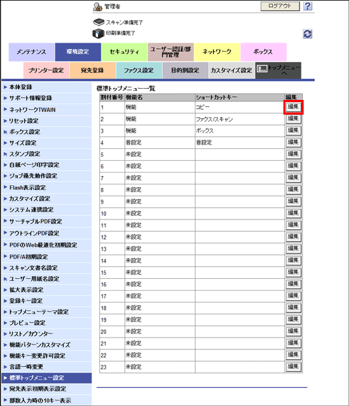 管理者モードの[環境設定]-[標準トップメニュー設定]で、ショートカットキーを配置するトップメニューキーの[割付番号]を選び、[編集]をクリックします。