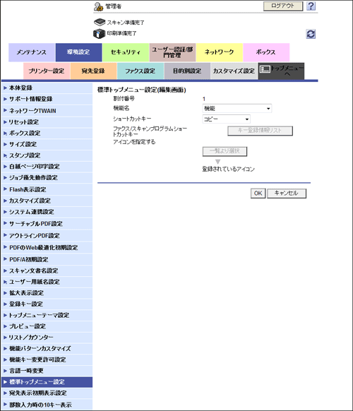 [アイコンを指定する] | コピープログラムまたはファクス/スキャンプログラムへのショートカットキーを作成した場合に、必要に応じて、トップメニューに表示するアイコンを選びます。 |