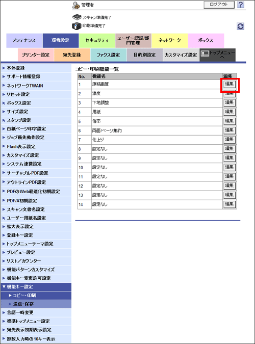 管理者モードの[環境設定]-[機能キー設定]-[コピー・印刷]で、設定を変更したい機能キーの番号を選び、[編集]をクリックします。