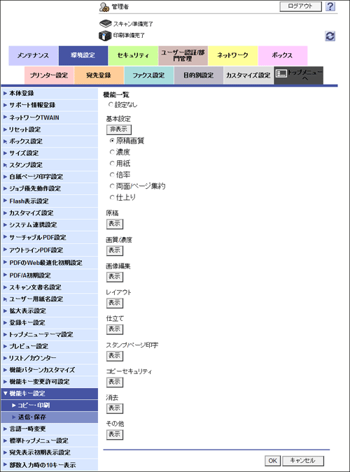 [コピー・印刷] | コピーモードのトップ画面と、ボックスモードの印刷設定画面に表示する機能キーの変更を許可するかどうかを選びます。 初期値は[禁止]です。 |