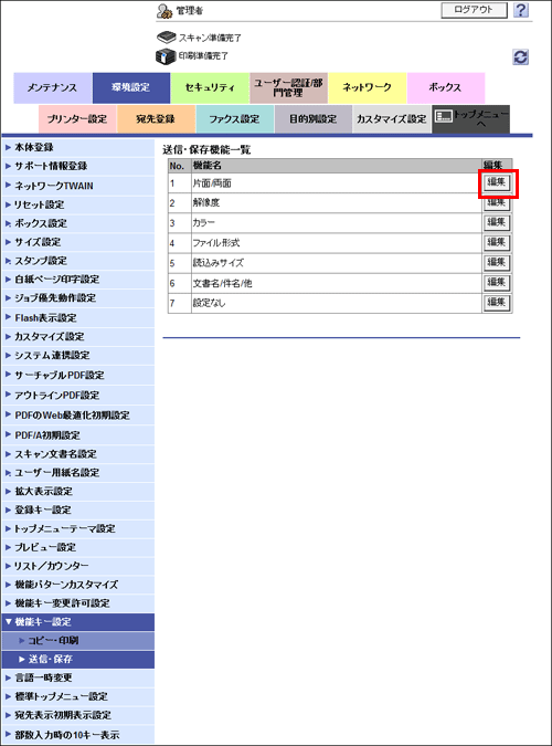 管理者モードの[環境設定]-[機能キー設定]-[送信・保存]で、設定を変更したい機能キーの番号を選び、[編集]をクリックします。