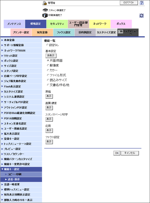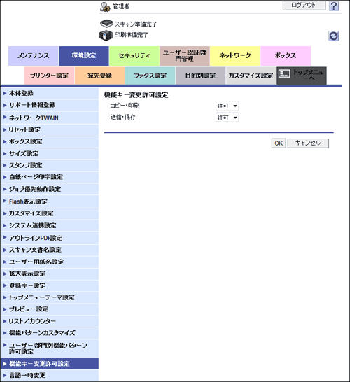 [送信・保存] | ファクス/スキャンモードのトップ画面と、ボックスモードの送信設定画面、保存設定画面に表示する機能キーの変更を許可するかどうかを選びます。 初期値は[禁止]です。 |