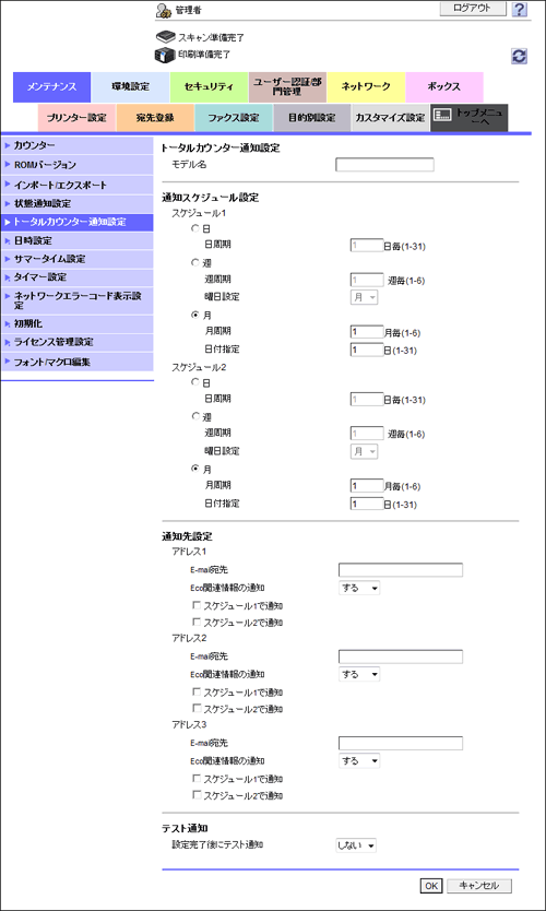 管理者モードの[メンテナンス]-[トータルカウンター通知設定]で、次の設定をします。