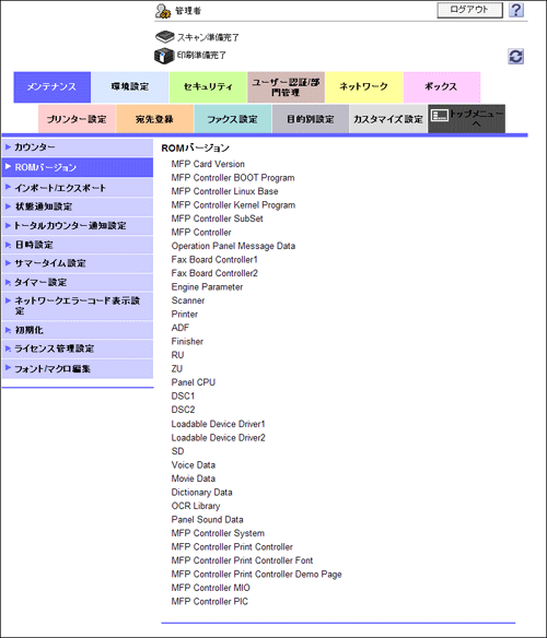 管理者モードの[メンテナンス]-[ROMバージョン]で、本機のROMバージョンを確認します。