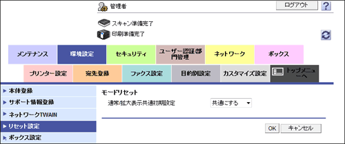 通常と拡大表示の設定値の変更を同時に行いたいときに、管理者モードの[環境設定]-[リセット設定]で、[通常/拡大表示共通初期設定]を[共通にする]を選びます(初期値:[共通にしない])。