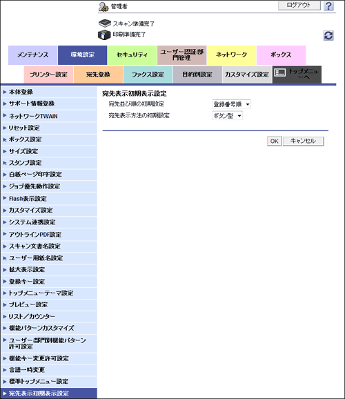 管理者モードの[環境設定]-[宛先表示初期表示設定]で、次の設定をします。