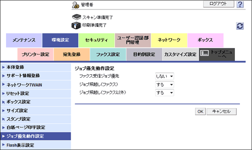 次のジョブがファクスの場合と、ファクス以外の場合とで、それぞれ前ジョブを飛越すかどうか設定できます。