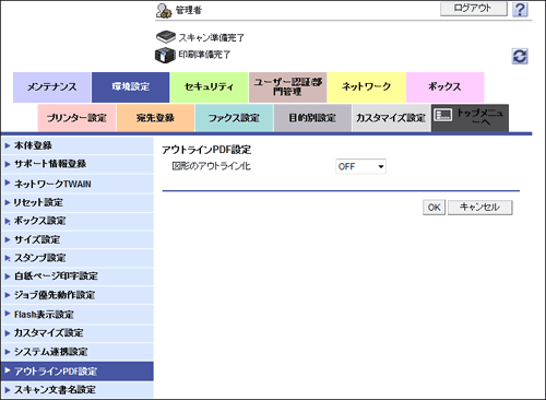 管理者モードの[環境設定]-[アウトラインPDF設定]で、次の設定をします。