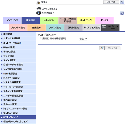 管理者モードの[環境設定]-[リスト/カウンター]で、[利用頻度・構成情報送信設定]を[許可]を選びます(初期値:[禁止])。