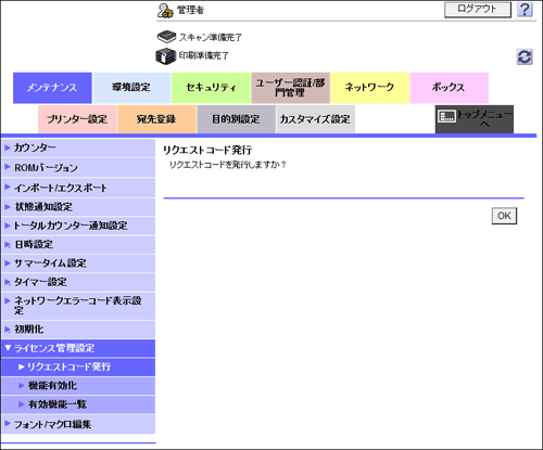 管理者モードの[メンテナンス]-[ライセンス管理設定]-[リクエストコード発行]で、[OK]をクリックします。